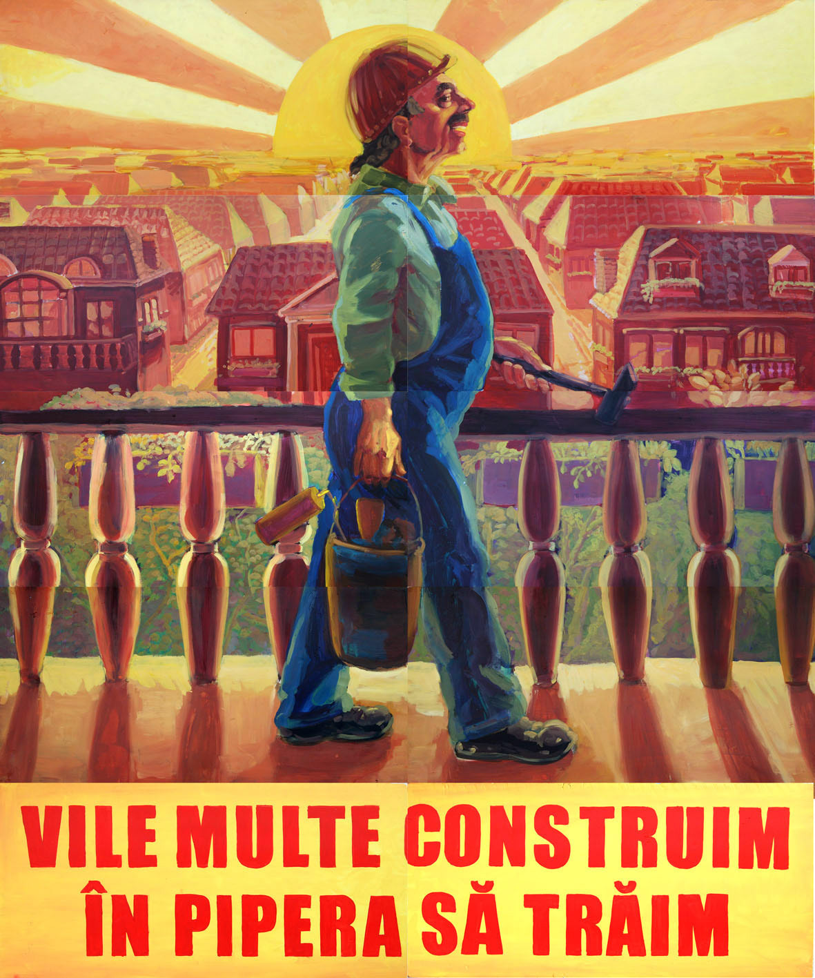" The theatricality of the characters, the monumentality of the sculpted bodies, the chromatic values, as well as the characteristic fonts from slogans exemplify the artistic style of the communist propaganda. "The Fresco..." has double political stakes: recovery through reference and questioning the values of contemporary society (...) It encourages reflection on the new type of worker, whose values are the result of capitalist propaganda".